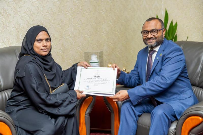 ކީރިތި ޤުރުއާން ހިތު ދަސްކޮށް އިމްތިހާނު ނިންމާ ފަރާތްތަކަށް ހިތްވަރު ދިނުމުގެ ގޮތުން އުމްރާގެ އަޅުކަން އަދާކުރުމަށް ފޮނުވާ ޕްރޮގްރާމްގެ ދަށުން، އަލްޙާފިޒާ ޝަބީނާ އާދަމް،(އަސްވާޑް، ގއ. ދެއްވަދޫ) އަށް ޢުމްރާ ދަތުރުގެ ލިޔުން ޙަވާލުކުރުން.