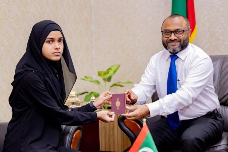 ކީރިތި ޤުރުއާން ހިތު ދަސްކޮށް 2025 ޖަނަވަރީ 12 ވަނަދުވަހު ޙާފިޡުކަމުގެ އިމްތިޙާނު ނިންމައި މަތީކާމިޔާބީއެއް ހޯދި އުމުރުން 17 އަހަރުގެ އާމިނަތު އިލްމާ ޠަލްޙަތު ( މއ.ރިހި ރާޅު، މާލެ) އާ އިސްލާމީކަންތައްތަކާ ބެހޭ ވަޒީރު ޑރ. މުޙައްމަދު ޝަހީމް ޢަލީ ސަޢީދު ބައްދަލުކުރައްވައި ހިތްވަރުދެއްވުން.