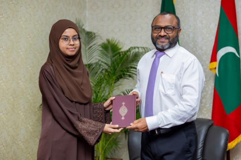 ޤުރްއާން ހިތުދަސްކޮށް ނިންމައި، ކީރިތި ޤުރްއާނާބެހޭ ޤައުމީ މަރުކަޒުގެ ޙާފިޡުން އިމްތިޙާނުކުރާ ކޮމެޓީއަށް ކިޔައިދީ ފާސްވި ޢުމުރުން 21 އަހަރުގެ ޢާއިޝަތު ނައުޝާ އިސްމާޢީލާއި އޭނާގެ ޢާއިލާއާ އިސްލާމީކަންތައްތަކާ ބެހޭ ވަޒީރު ޑރ. މުޙައްމަދު ޝަހީމް ޢަލީ ސަޢީދު ބައްދަލުކުރައްވައިފި.