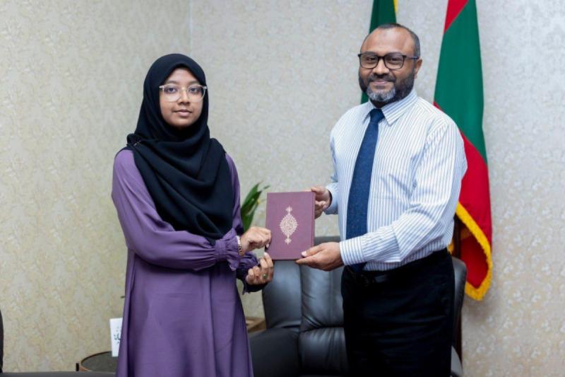 ޤުރްއާން ހިތުދަސްކޮށް ނިންމައި، ކީރިތި ޤުރްއާނާބެހޭ ޤައުމީ މަރުކަޒުގެ ޙާފިޡުން އިމްތިޙާނުކުރާ ކޮމެޓީއަށް ކިޔައިދީ ފާސްވި ޢާއިޝަތު ލީމް އަޙްމަދާއި އޭނާގެ ޢާއިލާއާ އިސްލާމީކަންތައްތަކާ ބެހޭ ވަޒީރު ޑރ. މުޙައްމަދު ޝަހީމް ޢަލީ ސަޢީދު ބައްދަލުކުރައްވައިފި.