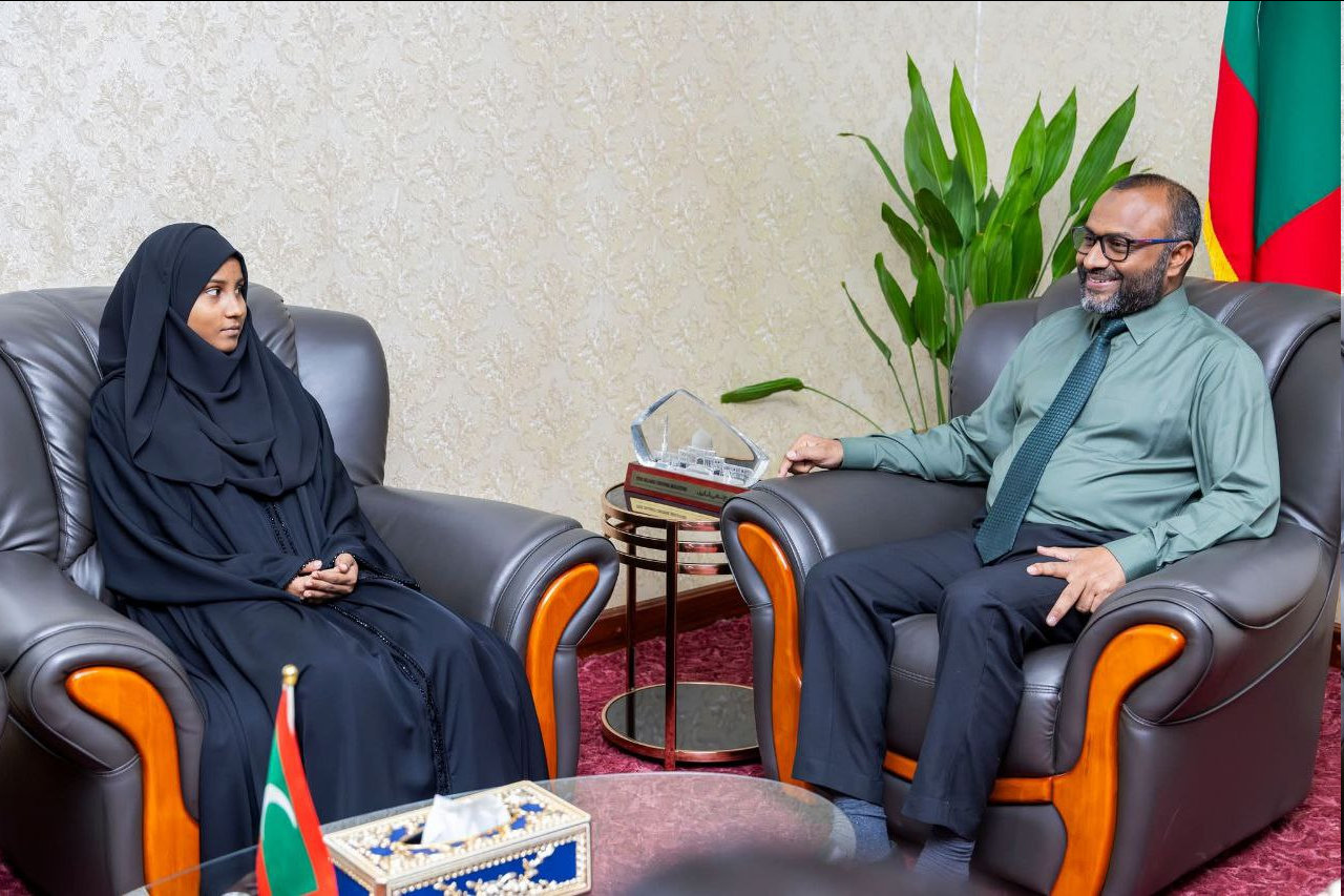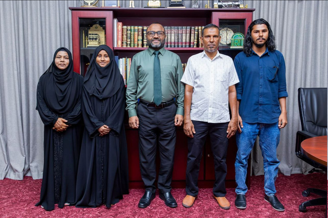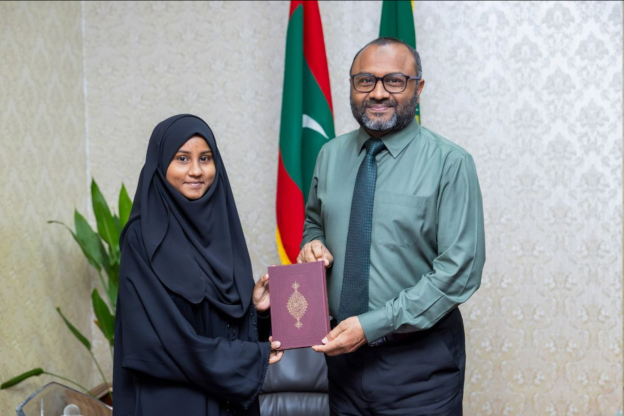 ޤުރްއާން ހިތުދަސްކޮށް ނިންމައި، ކީރިތި ޤުރްއާނާބެހޭ ޤައުމީ މަރުކަޒުގެ ކޮމެޓީއަށް ކިޔައިދީ ފާސްވިޢުމުރުން 19 އަހަރުގެ ޢާއިޝަތު ޝަވްނީ (ނައިސް/ށ.މިލަންދޫ) އާއި އޭނާގެ ބެލެނިވެރިންނާ އިސްލާމީކަންތައްތަކާ ބެހޭ ވަޒީރު ޑރ. މުޙައްމަދު ޝަހީމް ޢަލީ ސަޢީދު ބައްދަލުކުރައްވައި ހިތްވަރު ދެއްވުން.