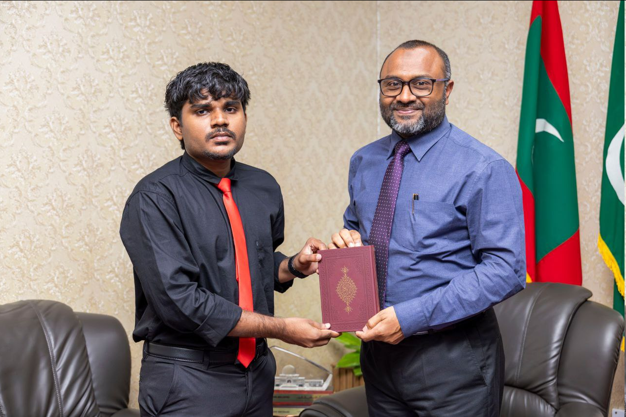އިސްލާމީކަންތައްތަކާ ބެހޭ ވަޒީރު ޑރ. މުޙައްމަދު ޝަހީމް އަލީ ސަޢީދު، ކީރިތި ޤުރުއާން ހިތުދަސްކޮށް، ފުރިހަމަ ކާމިޔާބީއެއް ހޯއްދެވި ބ. އޭދަފުށި، ގުލާބީވިލާ، އުމުރުން 20 އަހަރުގެ އަލްޙާފިޡް ޒާން މުޙައްމަދު ޖަމީލް އާއި އޭނާގެ ޢާއިލާއާއި ބައްދަލުކުރެއްވުން.