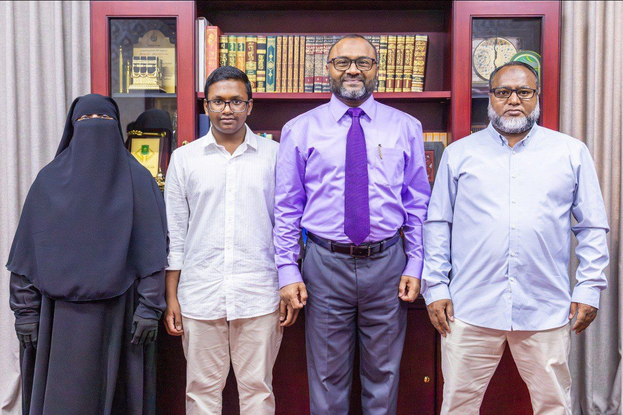 އިސްލާމީކަންތައްތަކާ ބެހޭ ވަޒީރު ޑރ. މުޙައްމަދު ޝަހީމް ޢަލީ ސަޢީދު، ޙާފިޒުކަމުގެ ސަނަދު ޙާސިލްކުރެއްވި އުމުރުން 15 އަހަރުގެ އަލްޙާފިޡު މާވީ ބިން މުޝްތާޤު (މަލަސް / އދ.ދަނގެތި) އާއި އޭނާގެ ބެލެނިވެރިންނާ ބައްދަލުކުރައްވައި މަރުހަބާ ދަންނަވައި ހިތްވަރު ދެއްވައިފި.