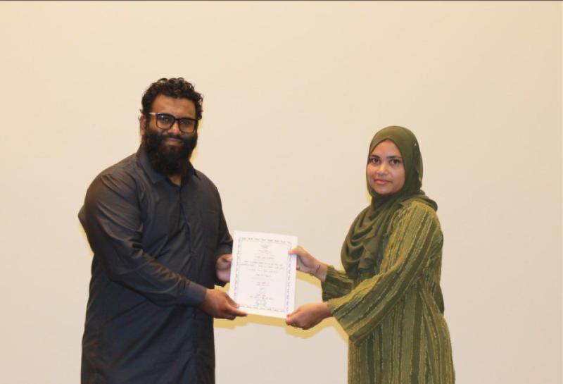 ކީރިތި ޤުރްއާނާބެހޭ ޤައުމީ މަރުކަޒުން "އަހަރެންވެސް ޢަރަބި ކިޔަވާނަންް" ގެ ނަމުގައި ހިންގި 1 ދުވަހުގެ ޢަރަބި ބަސް ދަސްކޮށްދިނުގެ ޕްރޮގްރާމް ނިންމައި ބައިވެރިންނަށް ސެޓްފިކެޓް ދިނުން.